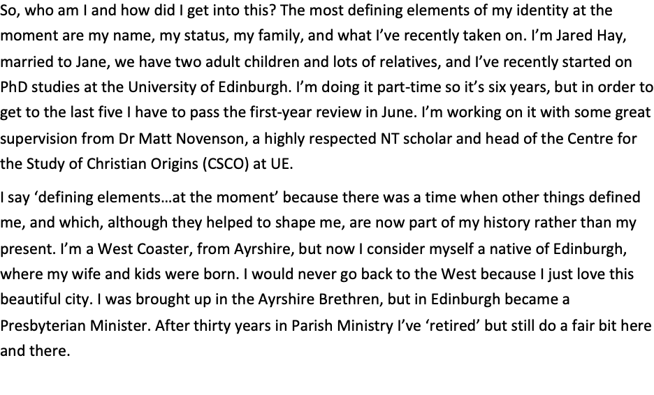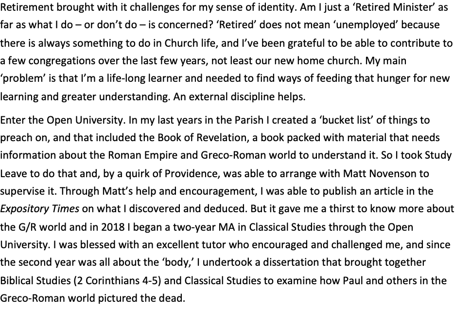 I'm a retired Minister, husband of Jane, father of two adult children and late life PhD student in Christian Origins.